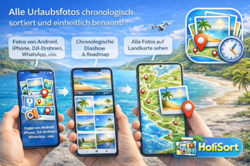 Du warst mit Freunden im Urlaub, alle haben fotografiert – mit Smartphones, Drohnen oder Kameras – und danach sammelt man die Bilder zusammen. Doch plötzlich stimmt die Reihenfolge nicht mehr, die Dateinamen sind durcheinander und niemand weiß, welches Foto wann entstanden ist.